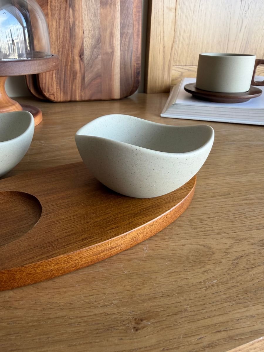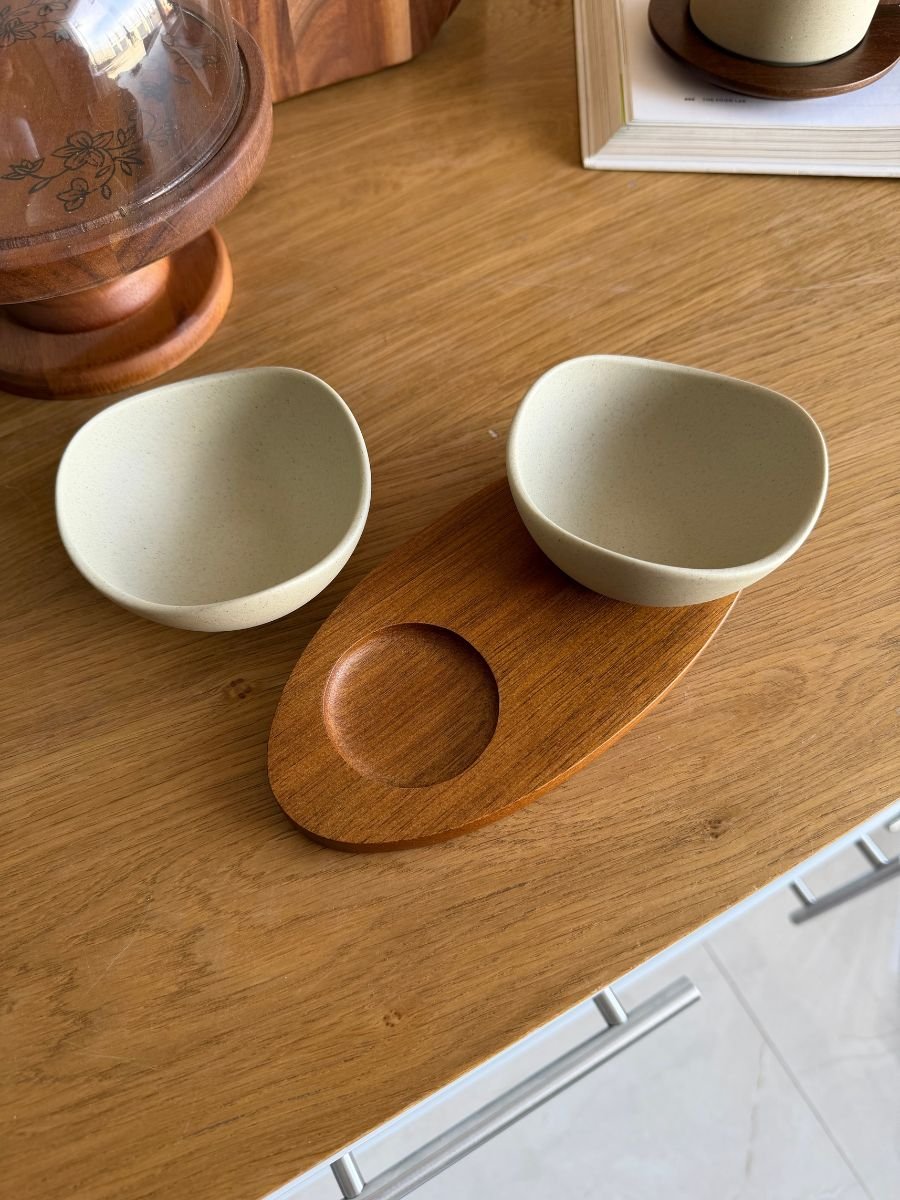 - Set Includes: 2 ceramic bowls + wooden tray