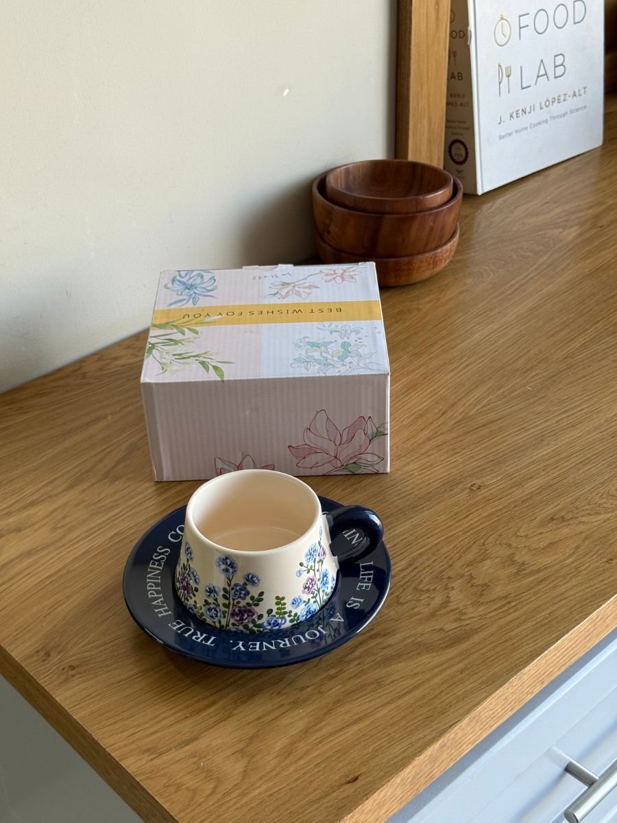 Elegant blue floral porcelain tea cup with saucer, featuring a delicate flower design and motivational quote on the saucer. Crafted from premium porcelain, perfect for daily tea rituals or as a stylish gift in a decorative box.