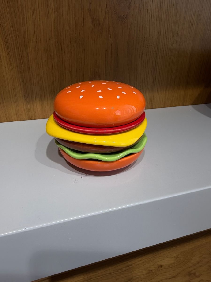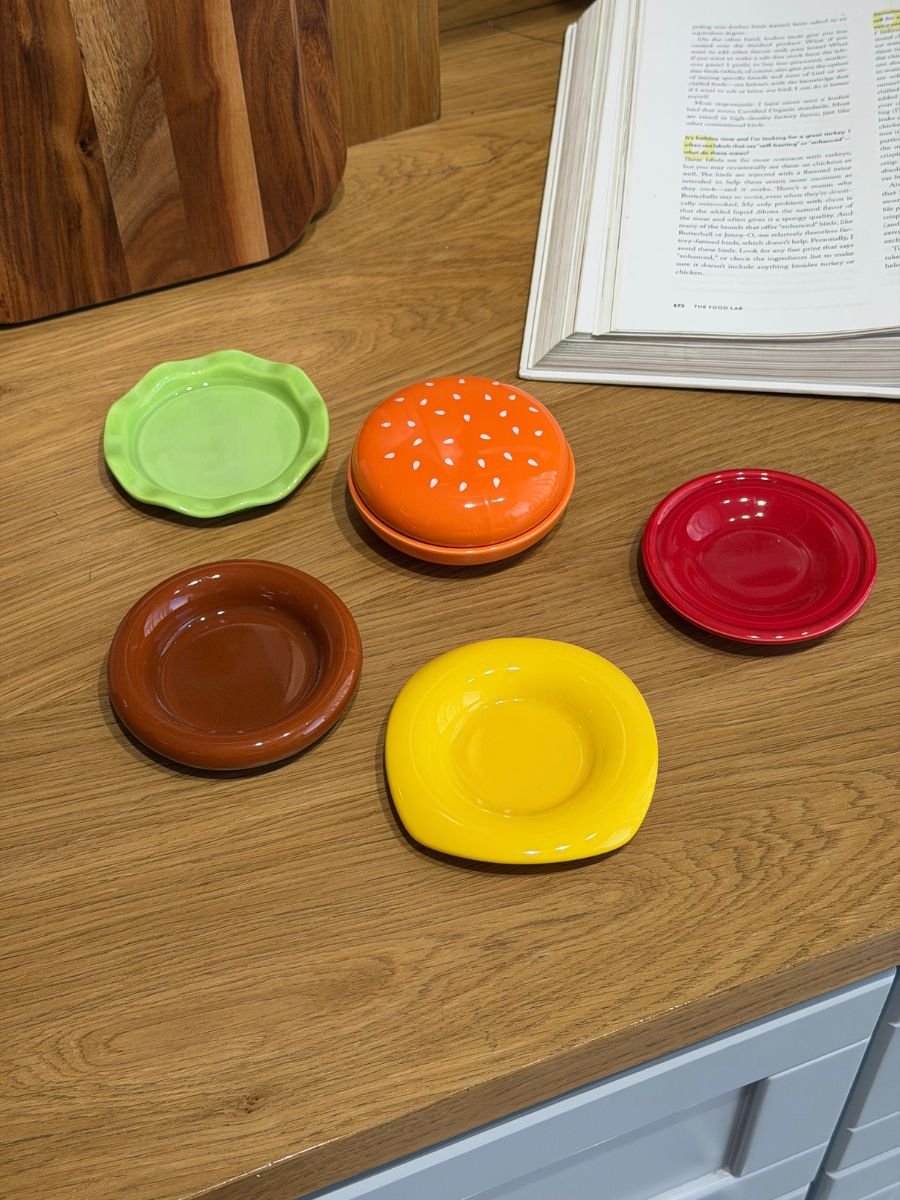 A fun and creative serving plate set inspired by the shape of a hamburger. Adds a playful and modern touch to your table, perfect for serving appetizers, sauces, desserts, or snacks.