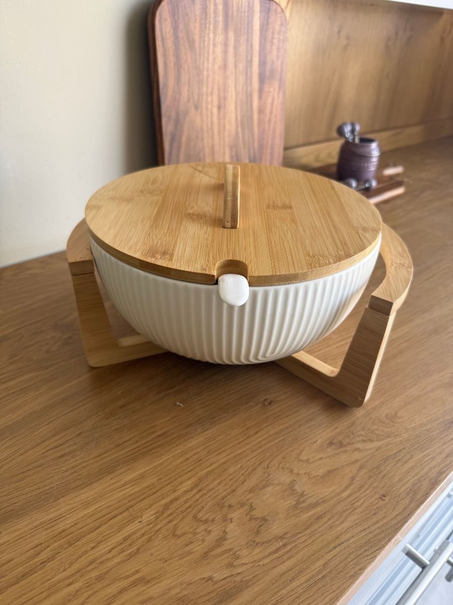 Ceramic Bowl with Lid, Wooden Base, and Spoon