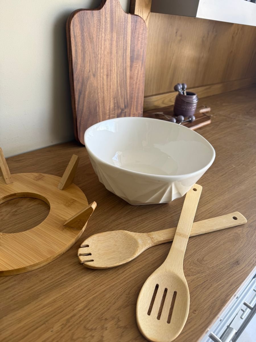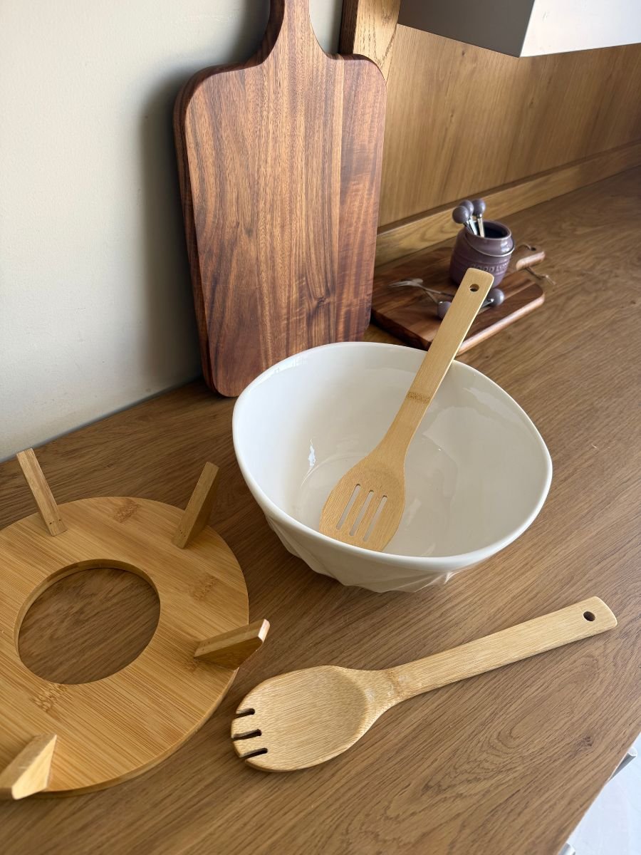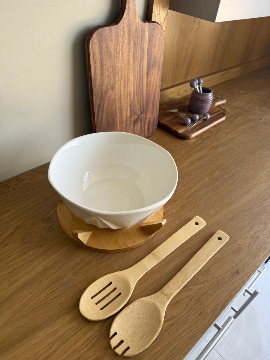 Ceramic Serving Bowl with Wooden Base & Bamboo Utensils