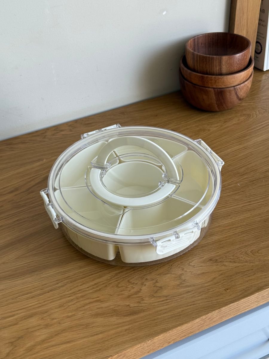 Original Tupperware round snack box with a rotating design, perfect for organizing and serving snacks or appetizers. Features multiple separate compartments with an airtight lid to keep food fresh and prevent odors. Made from BPA-free, food-safe materials, easy to clean, and ideal for daily use or gatherings.