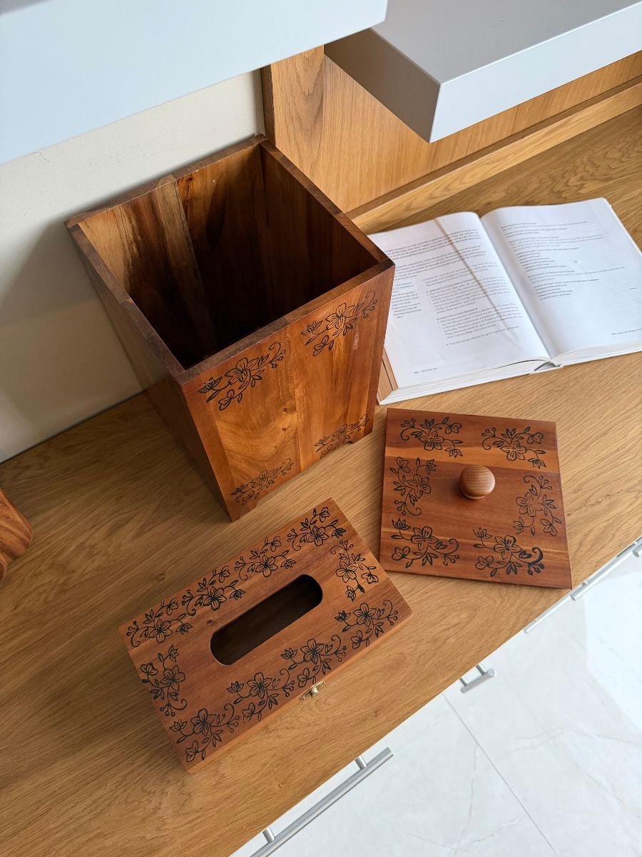طقم أنيق مصنوع من خشب طبيعي عالي الجودة، يتكوّن من سلة خشبية وعلبة مناديل بتصميم متناسق ومزخرف بنقوش تقليدية راقية. يجمع بين العملية والجمال ويضفي لمسة فخامة على المكان، مما يجعله مناسبًا للاستخدام في المطبخ، غرفة المعيشة، المكتب أو الحمام.
