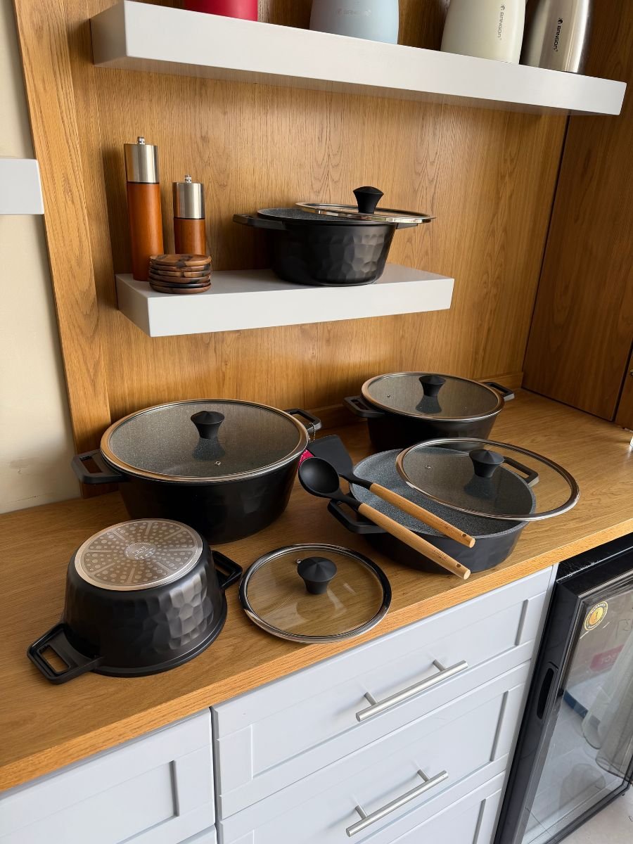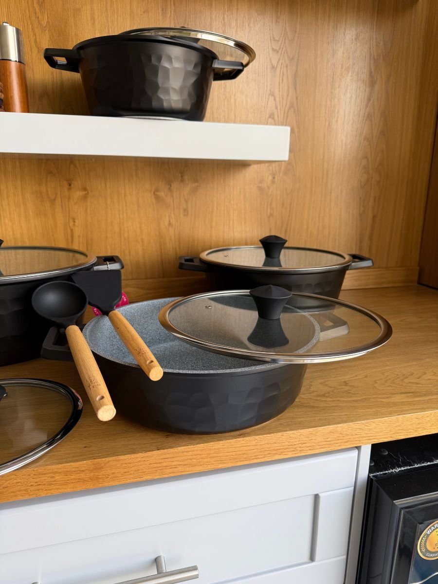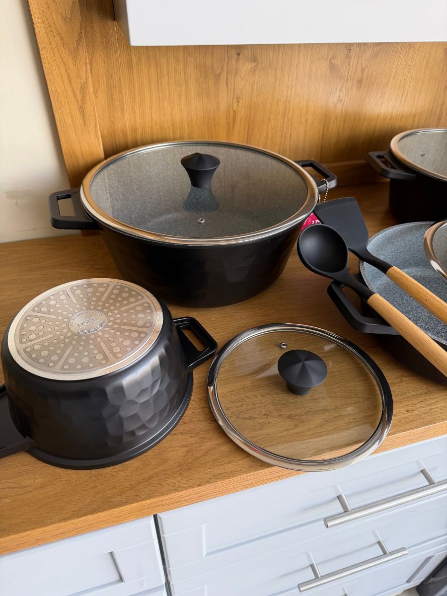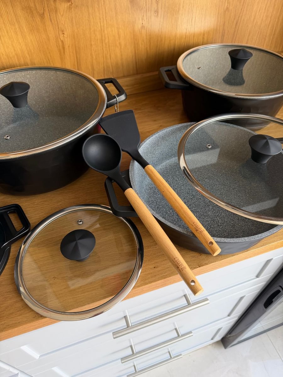 طقم قدور OSE عالي الجودة، مصنوع بطبقة غير لاصقة آمنة وخالية من مادة PFOA، مع طلاء متين من الداخل والخارج لسهولة التنظيف وعمر استخدام طويل. يتميز بجسم سميك يضمن توزيعًا متساويًا للحرارة، ومناسب لمختلف أنواع المواقد. يأتي مع أغطية زجاجية قوية، بالإضافة إلى ملعقتين سيليكون هدية.