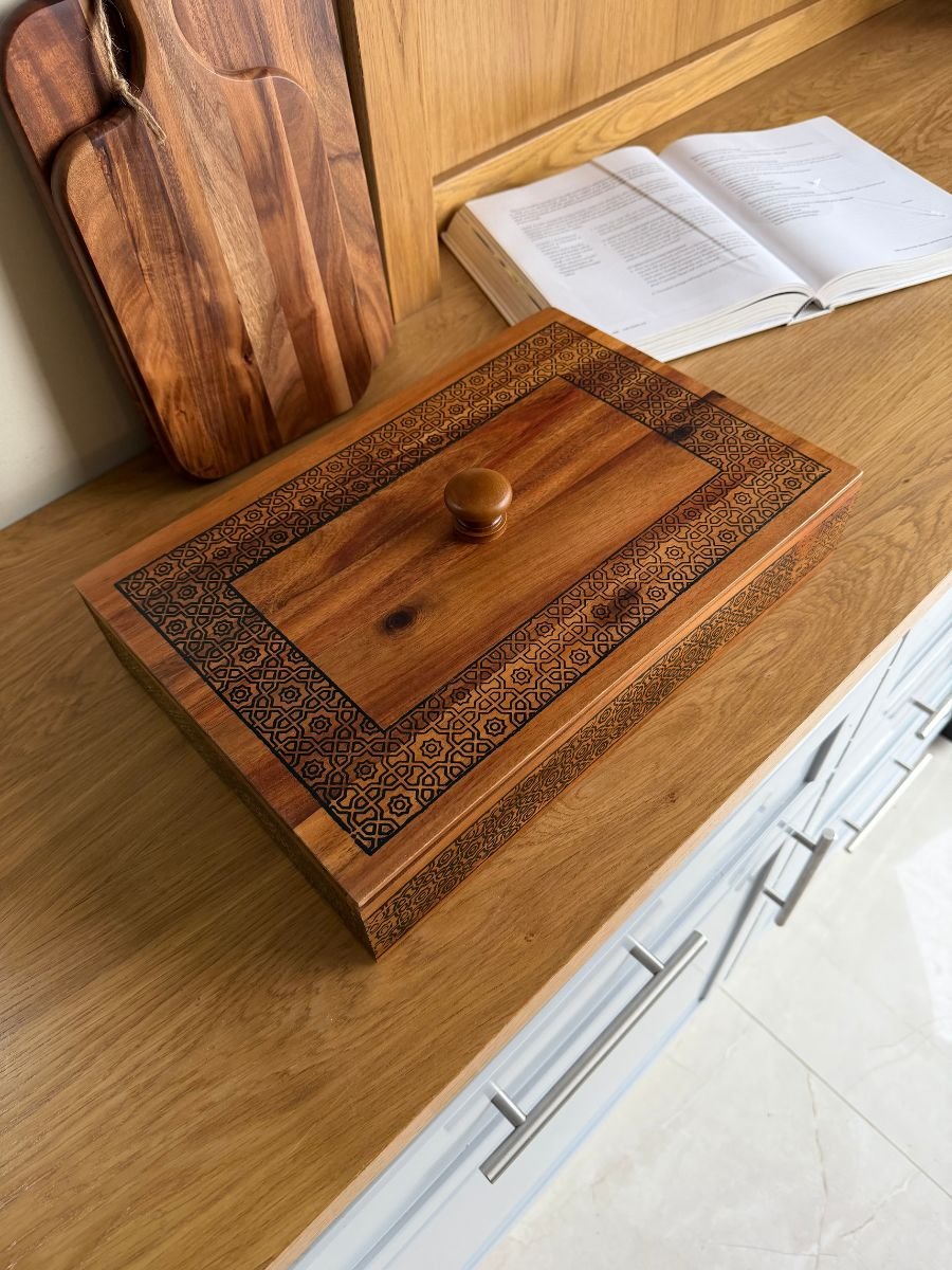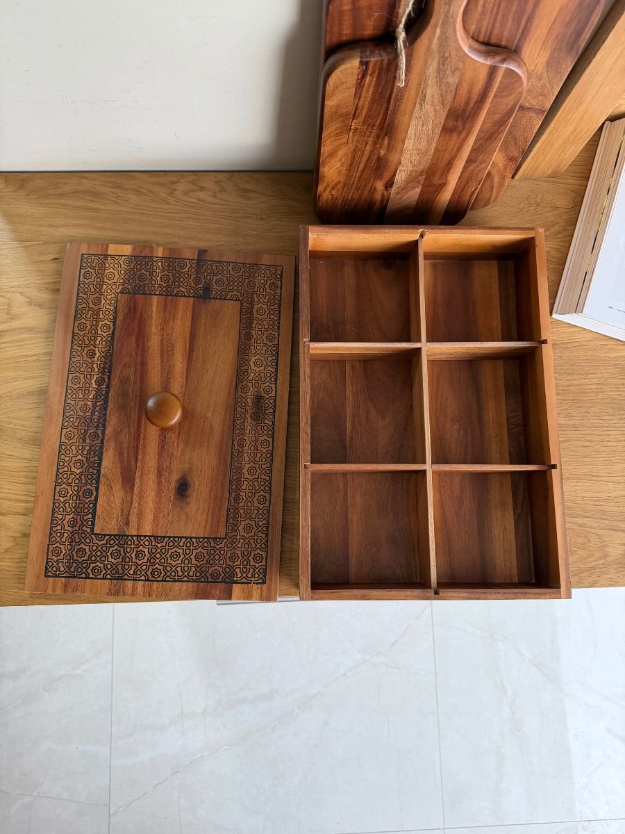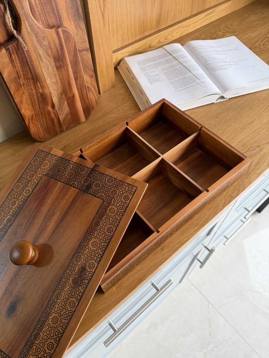 علبة تخزين خشبية أنيقة بتصميم مستطيل عملي، مصنوعة من خشب طبيعي عالي الجودة. تحتوي على عدة أقسام داخلية تساعد على تنظيم الشاي، الأعشاب، المكسرات، الحلويات أو الأغراض الصغيرة. تتميز بغطاء خشبي مزخرف بنقوش أنيقة مع مقبض علوي، مما يجعلها مثالية للاستخدام اليومي أو للتقديم في الضيافة.
